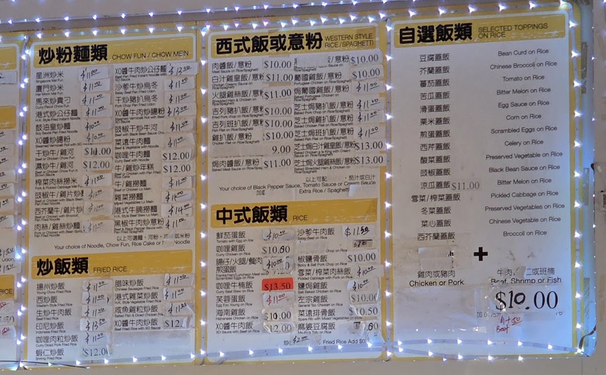 Rice and Noodles: The menu includes classic rice and noodle dishes such as beef chow fun, baked spaghetti with meat sauce, and fried rice with various toppings. These are typically chosen for lunch or dinner meals.