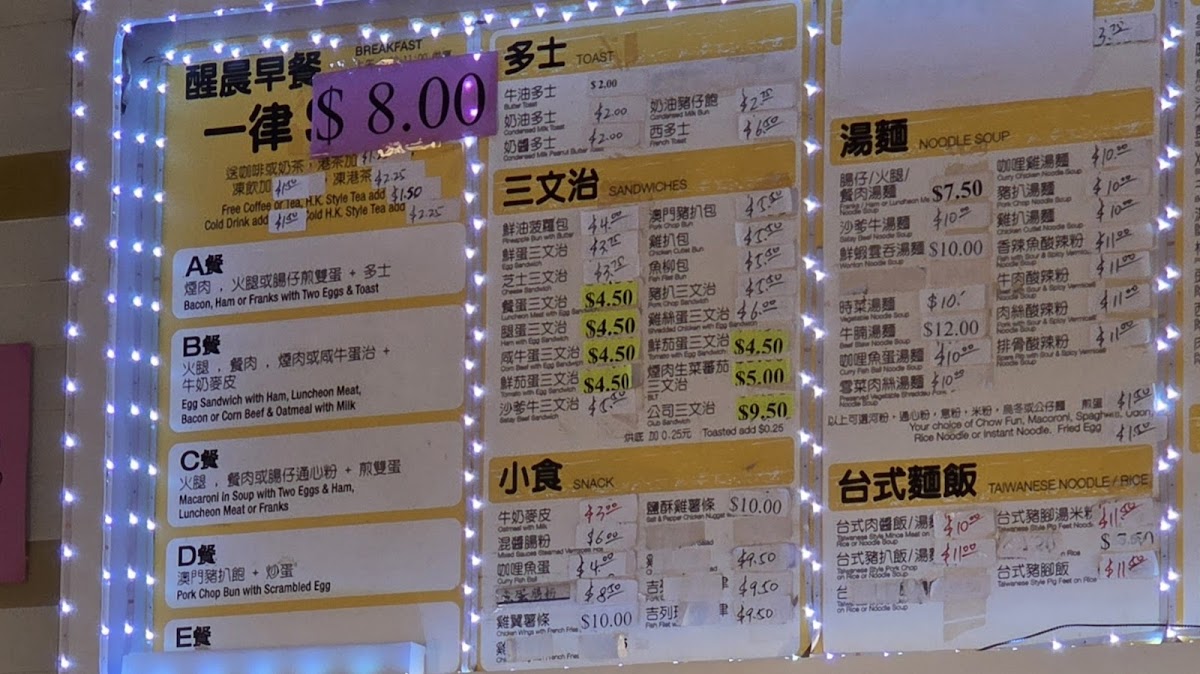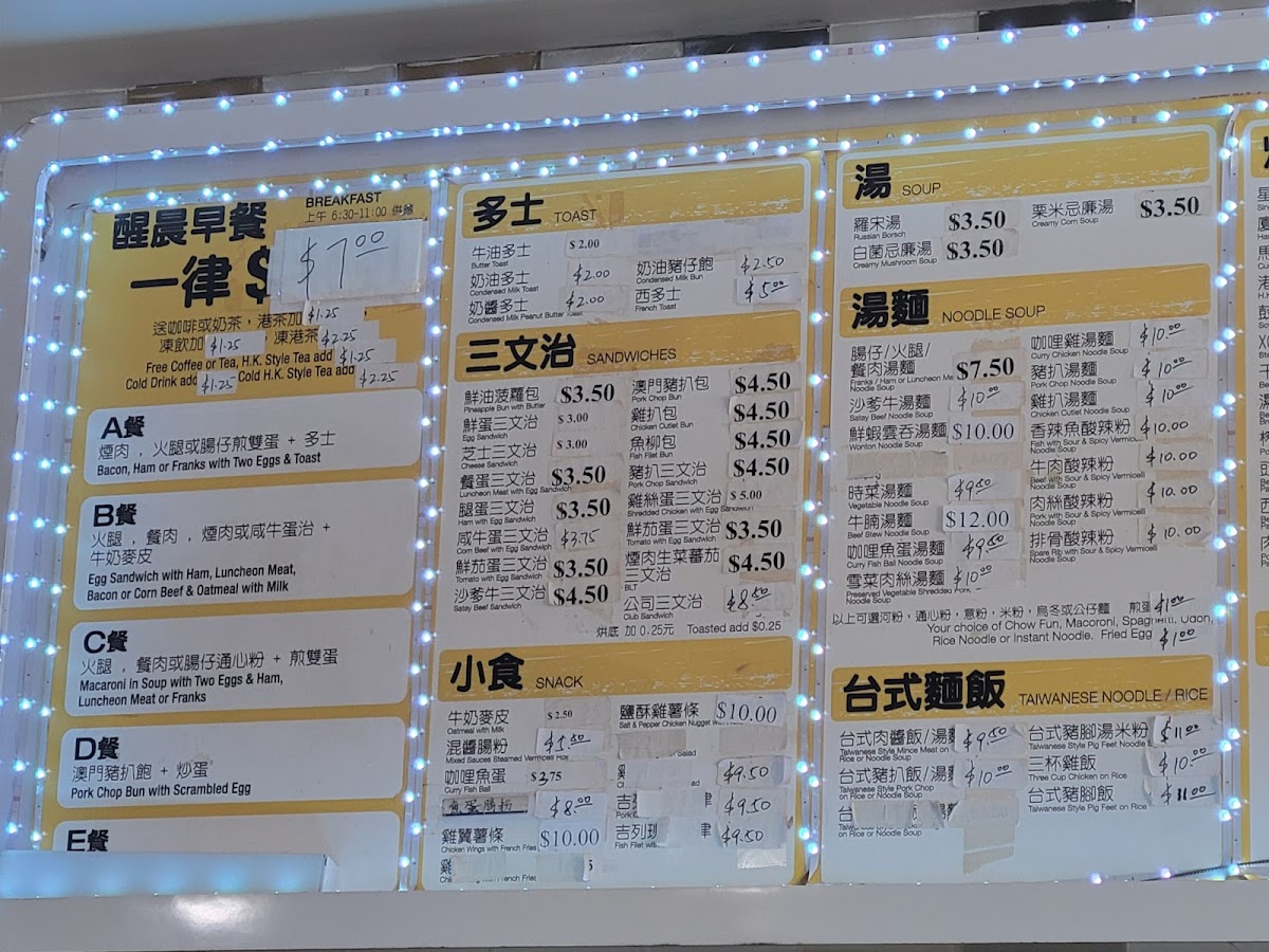 Breakfast and Light Bites: This section includes traditional Hong Kong-style breakfast items such as rice rolls with mixed sauces, condensed milk toast, pineapple buns with butter, and egg sandwiches. These options are ideal for morning meals or light snacks throughout the day.